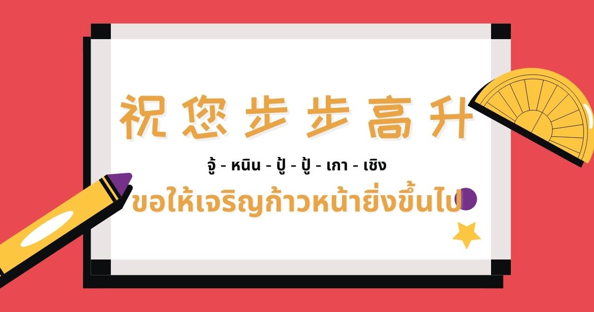 - 祝 您 步 步 高 升 (จู้ – หนิน – ปู้ – ปู้ – เกา – เชิง) แปลว่า ขอให้เจริญก้าวหน้ายิ่งขึ้นไป