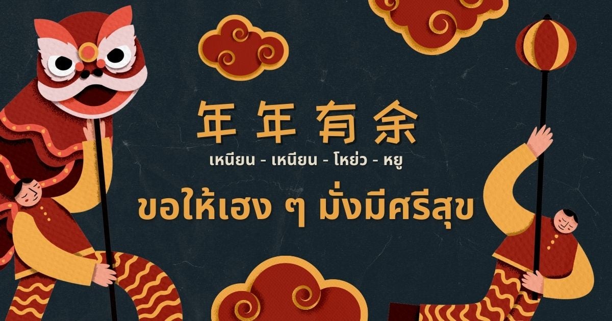 - 年 年 有 余 (เหนียน – เหนียน – โหย่ว – หยู) แปลว่า ขอให้เฮง ๆ มั่งมีศรีสุข