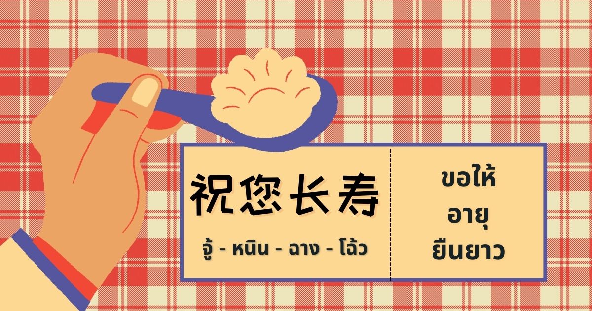 - 祝 您 长 寿 (จู้ – หนิน – ฉาง – โฉ้ว) แปลว่า ขอให้อายุยืนยาว