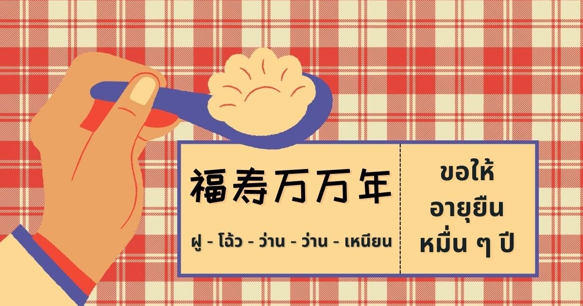 - 福 寿 万 万 年 (ฝู – โฉ้ว – ว่าน – ว่าน – เหนียน) แปลว่า ขอให้อายุยืนหมื่น ๆ ปี