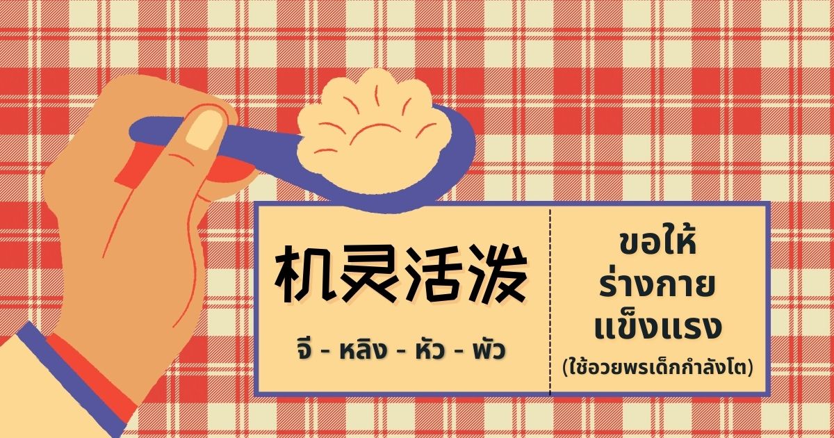 - 机灵活泼 (จี – หลิง – หัว – พัว) แปลว่า ขอให้ร่างกายแข็งแรง (ใช้อวยพรเด็กกำลังโต)