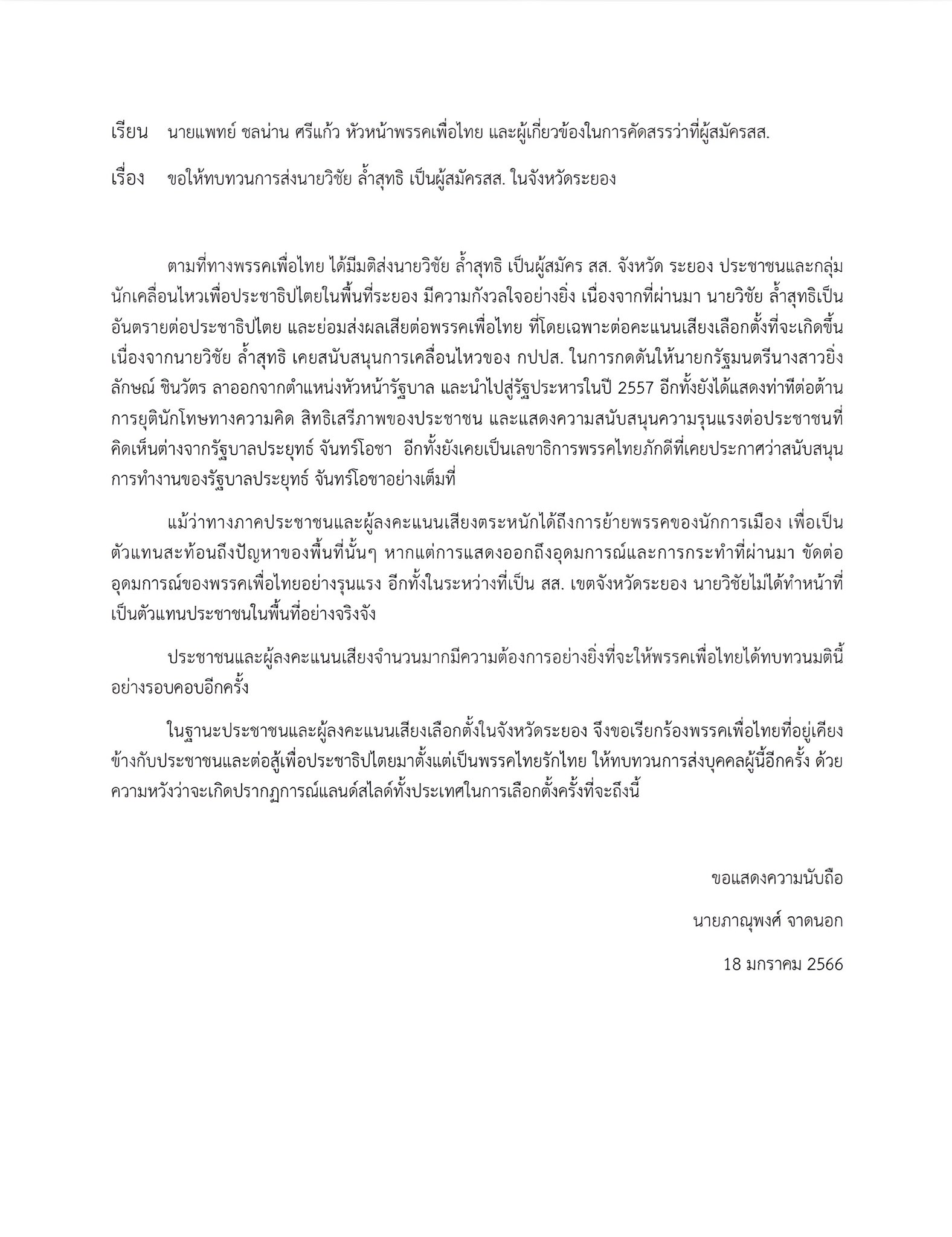 นายภาณุพงศ์ จาดนอก หรือ ไมค์ ระยอง นักกิจกรรมทางการเมือง แนวร่วมราษฎร ร่อนจดหมายจากทวิตเตอร์ทำหนังสือถึง ถึง นพ.ชลน่าน ศรีแก้ว หัวหน้าพรรคเพื่อไทย และผู้เกี่ยวข้องในการคัดว่าที่ผู้สมัคร ส.ส. ขอให้ทบทวนการส่ง นายวิชัย ล้ำสุทธิ เป็นผู้สมัคร ส.ส.ในจังหวัดระยอง