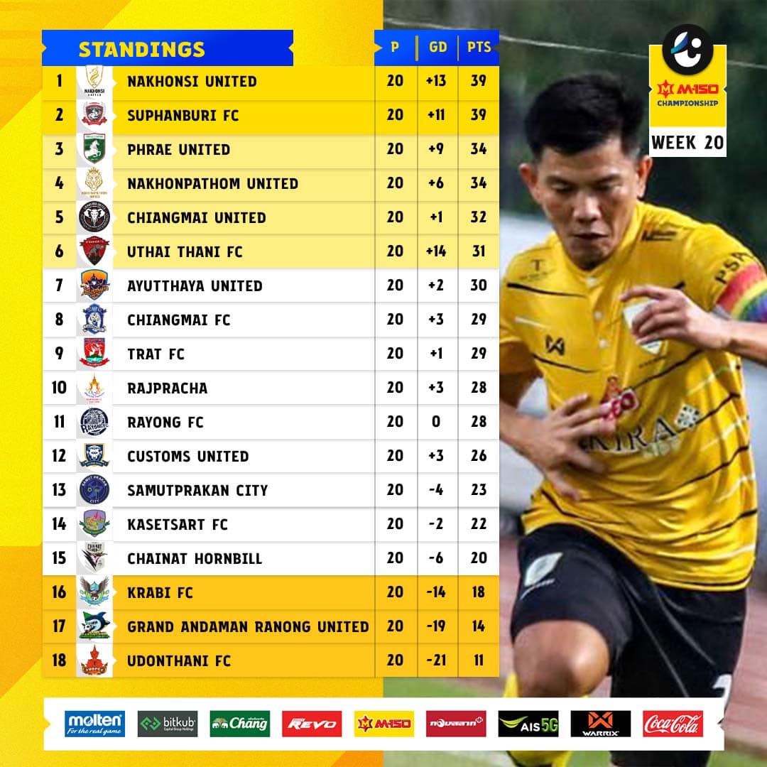 สถานการณ์ ตารางคะแนน ล่าสุดของศึก ไทยลีก2 M-150 แชมเปี้ยนชิพ เกมล่าสุดทีมนำต่างพ่ายแพ้ด้วยกันทั้งคู่ ทำให้ นครศรี ยูไนเต็ด ยังคงนำจ่าฝูงอยู่ด้วยการมี 39 คะแนน เท่ากับ สุพรรณบุรี เอฟซี แต่ประตูได้-เสีย ยังดีกว่า ส่วนอันดับสามเป็นของ แพร่ ยูไนเต็ด ที่มีอยู่ 34 คะแนน