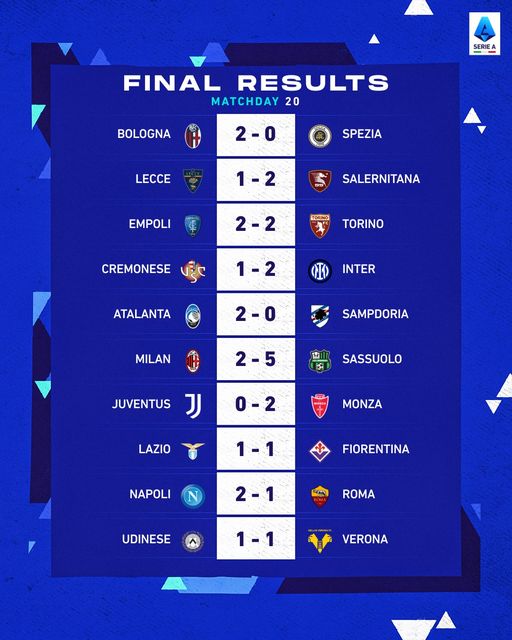สถานการณ์ตารางคะแนนล่าสุดของศึก กัลโช่ เซเรียอา หลังจบสัปดาห์ที่ 20 นั้น ยังเป็น นาโปลี ที่นำห่างเป็นจ่าฝูง ด้วยการมี 53 แต้ม ส่วน อินเตอร์ มิลาน ขยับขึ้นมารั้งอยู่รองจ่าฝูงแล้ว ด้วยการมี 40 แต้ม และอันดับที่สามเป็น ลาซิโอ ที่มี 38 คะแนน เท่ากับ อตาลันต้า และ เอซี มิลาน
