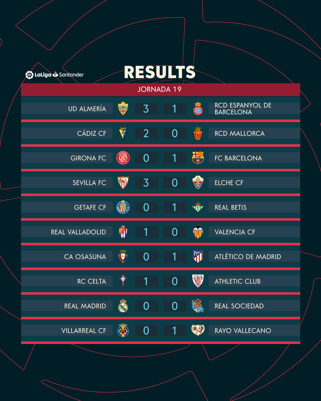 สรุปผลการแข่งขัน ลาลีกา สเปน หลังจบสัปดาห์ที่ 19