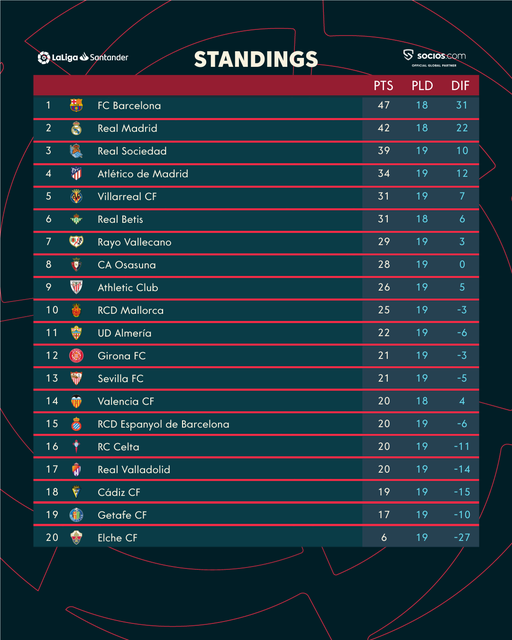 สถานการณ์ตารางคะแนนล่าสุดของศึก ลาลีกา นั้น บาร์เซโลน่า นำห่างเป็นจ่าฝูง ด้วยการมี 47 คะแนน ส่วน เรอัล มาดริด เป็นรองจ่าฝูงด้วยการมี 42 แต้ม ส่วนอันดับสามเป็นของ เรอัล โซเซียดาด ที่มีอยู่ 39 คะแนน และ แอต.มาดริด อยู่ที่ 4 มี 34 แต้ม