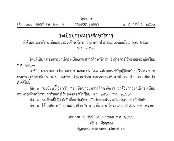 เว็บไซต์ ราชกิจจานุเบกษา เผยแพร่ระเบียบกระทรวงศึกษาธิการ การยกเลิกระเบียบกระทรวงศึกษาธิการ ว่าด้วยการไว้ทรงผมของนักเรียน พ.ศ.2563 พ.ศ.2566 หรือ ยกเลิกระเบียบทรงผมนักเรียน ลงนามโดย น.ส.ตรีนุช เทียนทอง รมว.ศึกษาธิการ (ศธ.) ระบุว่า โดยที่เป็นการสมควรยกเลิกระเบียบกระทรวงศึกษาธิการ ว่าด้วยการไว้ทรงผมของนักเรียน พ.ศ.2563