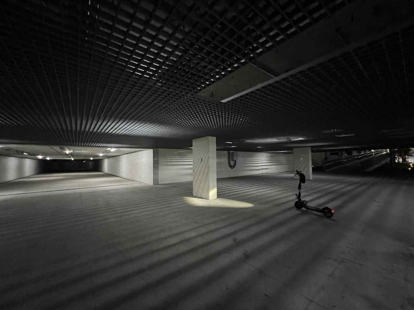 ในการเดินทางผ่านความมืดครั้งนี้ ผมอาศัยแสงสว่างจากไฟหน้าสกูตเตอร์คู่ใจ Ninebot F25เมื่อข้ามมาสุดทาง จากทางเดินกว้างใหญ่ไพศาลี (ที่แสงสว่างอาจจะน้อยไปหน่อย) ก็จะพบกับทางหักมุมเลียวขวาครับ เป็นทางลาดขึ้นสู่ระดับพื้นดิน กว้างประมาณสองเมตรกว่าๆ