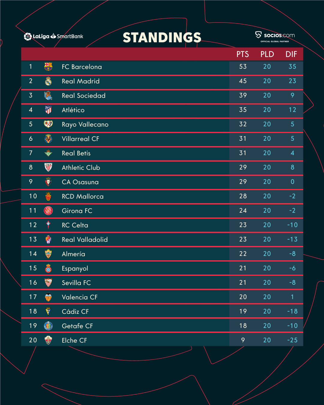 อันดับตารางคะแนน ลาลีกา สเปน 2022/2023 หลังจบนัดที่20 โดย 5 อันดับแรกในตารางเป็นไปตามลำดับมีดังนี้
