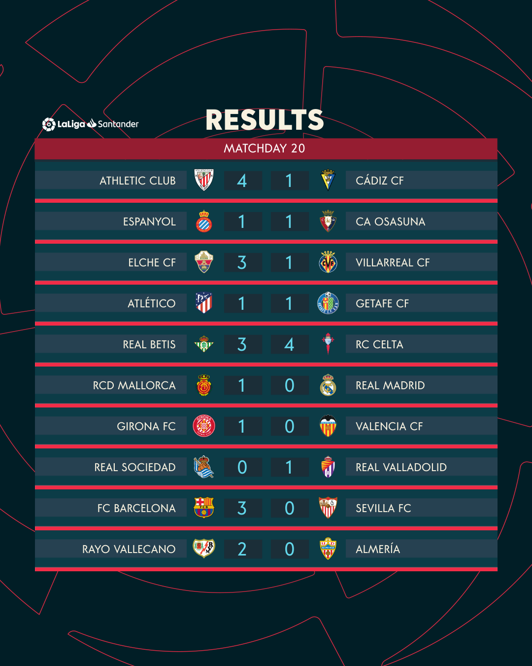 สรุปผลการแข่งขัน ลาลีกา สเปน หลังจบสัปดาห์ที่ 20