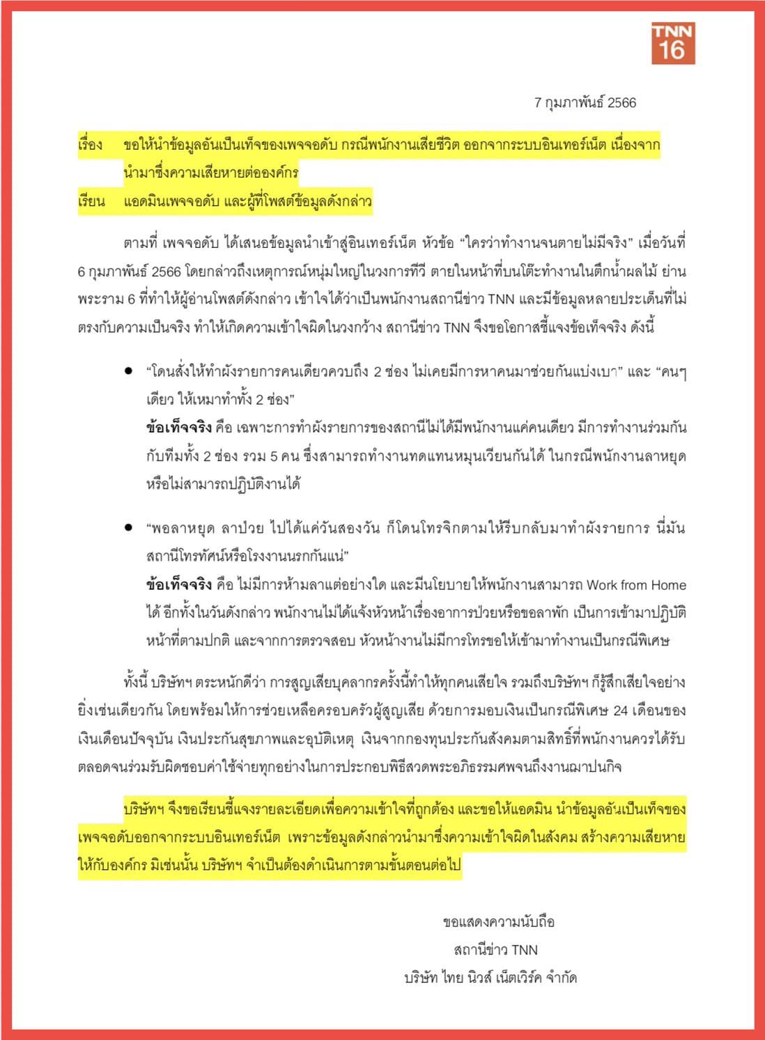ตามที่ เพจจอดับ ได้เสนอข้อมูลนำเข้าสู่อินเทอร์เน็ต หัวข้อ “ใครว่าทำงานจนตายไม่มีจริง” เมื่อวันที่ 6 กุมภาพันธ์ 2566 โดยกล่าวถึงเหตุการณ์หนุ่มใหญ่ในวงการทีวี ตายในหน้าที่บนโต๊ะทำงานในตึกน้ำผลไม้ ย่าน พระราม 6 ที่ทำให้ผู้อ่านโพสต์ดังกล่าว เข้าใจได้ว่าเป็นพนักงานสถานีข่าว TNN และมีข้อมูลหลายประเด็นที่ไม่ ตรงกับความเป็นจริง ทำให้เกิดความเข้าใจผิดในวงกว้าง สถานีข่าว TNN จึงขอโอกาสชี้แจงข้อเท็จจริง ดังนี้