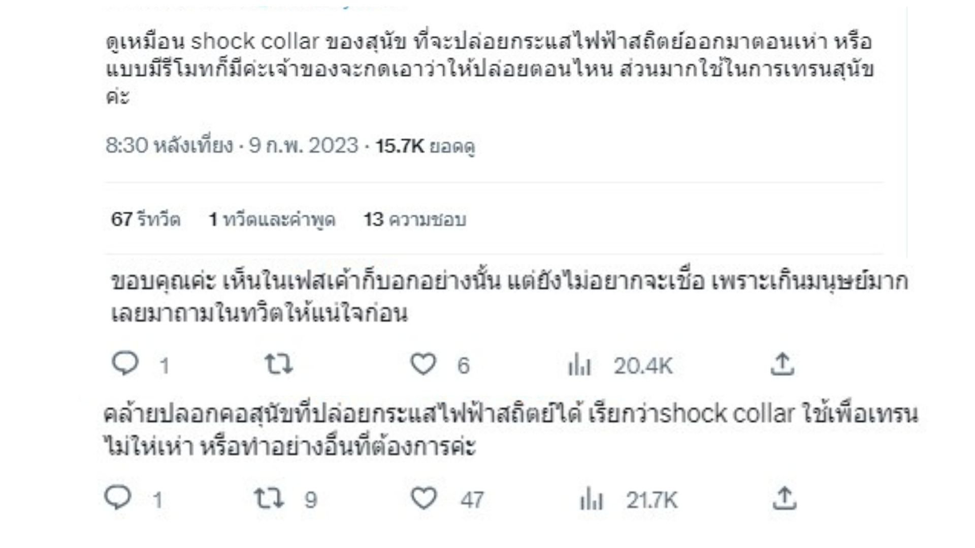 “ดูเหมือน shock collar ของสุนัข ที่จะปล่อยกระแสไฟฟ้าสถิตย์ออกมาตอนเห่า หรือแบบมีรีโมทก็มีค่ะเจ้าของจะกดเอาว่าให้ปล่อยตอนไหน ส่วนมากใช้ในการเทรนสุนัขค่ะ”