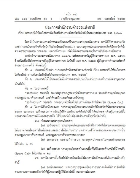 ราชกิจจานุเบกษา ออกประกาศ ยกเว้นคาดเข็มขัดนิรภัย ในรถยนต์บางประเภท ใช้บังคับเมื่อพ้นกำหนดสามสิบวันนับแต่วันประกาศในราชกิจจานุเบกษาเป็นต้นไป