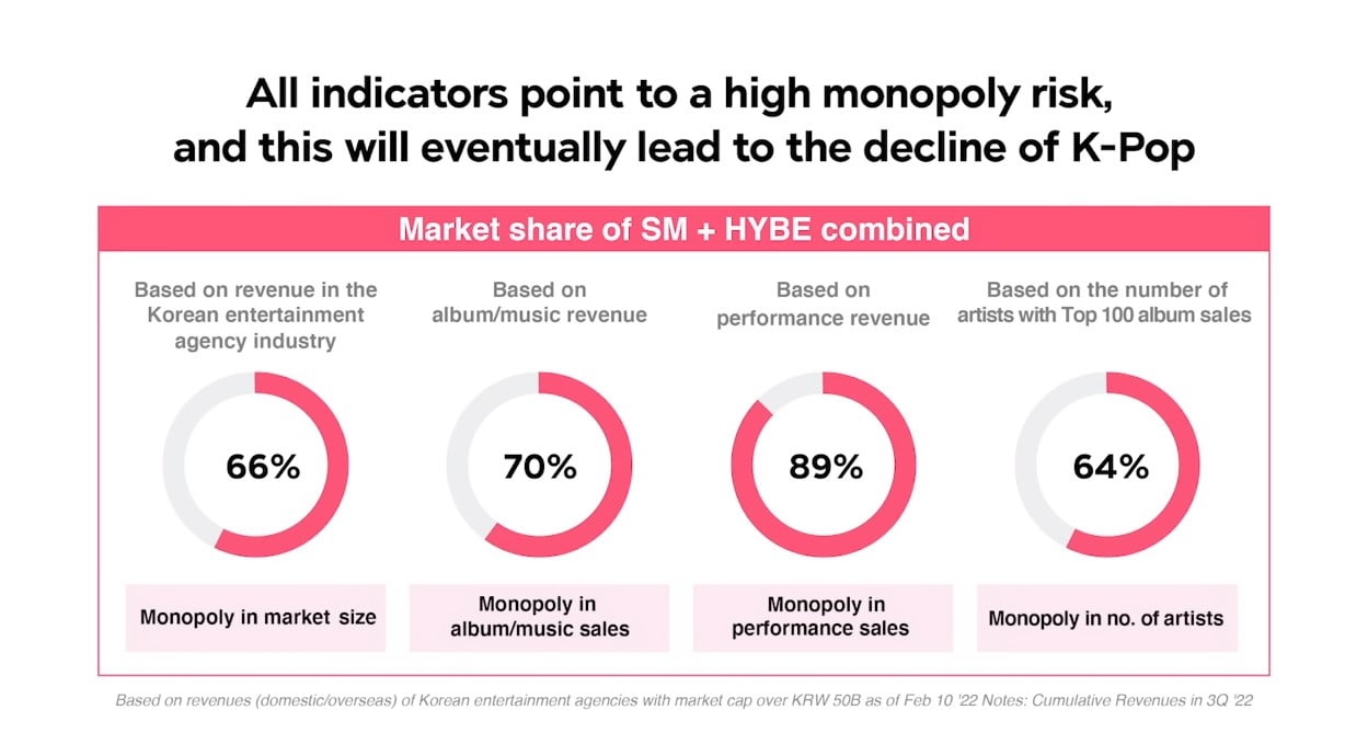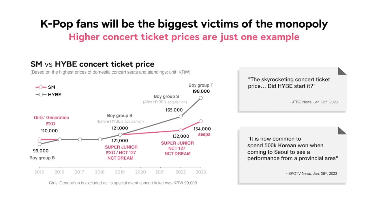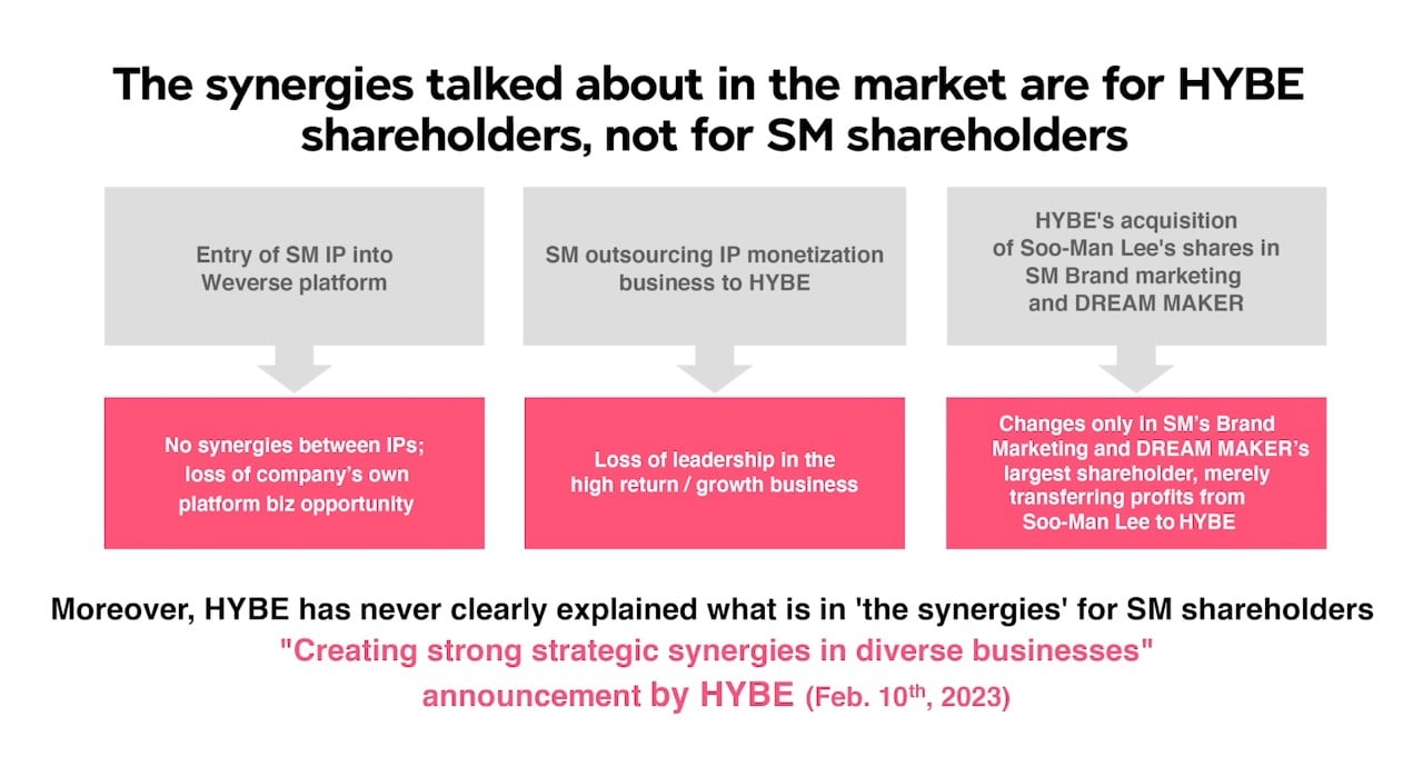 “หาก HYBE เข้าครอบครอง SM ก็หลีกเลี่ยงไม่ได้ที่ SM จะต้องตกอยู่ภายใต้การปกครองที่อ่อนแอ ด้วยเวลาปล่อยอัลบั้มที่ดีที่สุดที่จำกัดไว้ที่ 100 ครั้งต่อปี HYBE จึงอิ่มตัวกับศิลปินจากค่ายเพลงของตนแล้ว เป็นผลให้ศิลปินของ SM ไม่มีทางเลือกอื่นนอกจากต้องถูกลดความสำคัญลง