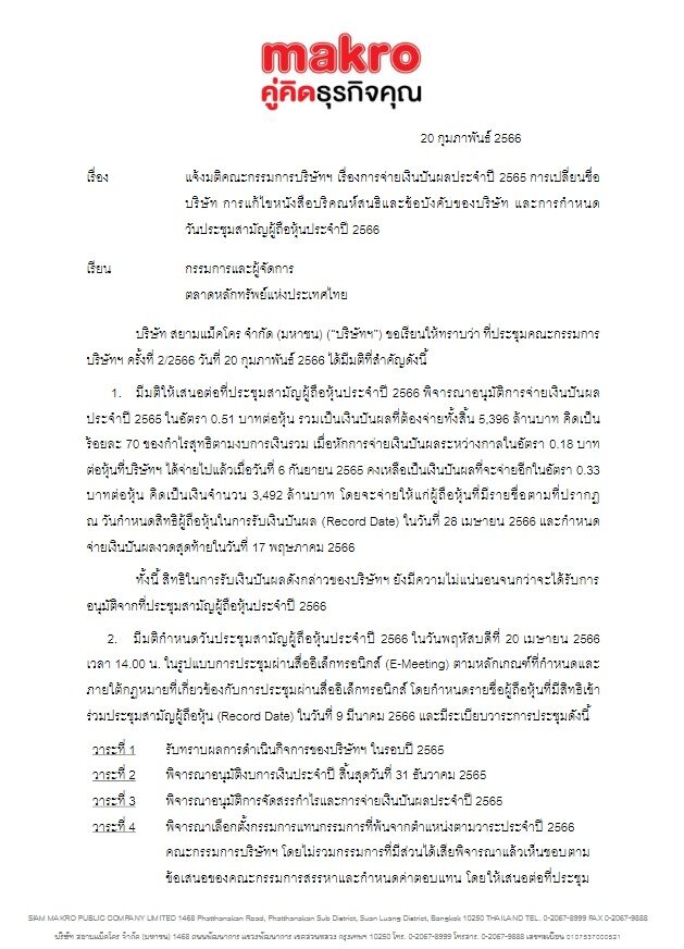 จากเอกสารที่ทางแม็คโครเผยแพร่ออกนั้นระบุว่า “บริษัท สยามแม็คโคร จำกัด (มหาชน) (“บริษัทฯ”) ขอเรียนให้ทราบว่า ที่ประชุมคณะกรรมการ บริษัทฯ ครั้งที่ 2/2565 วันที่ 20 กุมภาพันธ์ 2556 ได้มีมติที่สำคัญดังนี้
