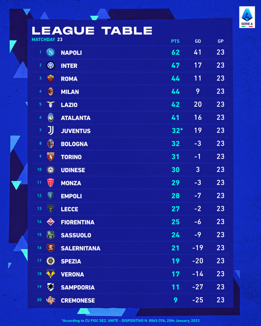 อันดับ ตารางคะแนน กัลโช่ เซเรียอา อิตาลี 2022 2023 หลังจบนัดที่23 โดย 5 อันดับเป็นไปตามลำดับมีดังนี้