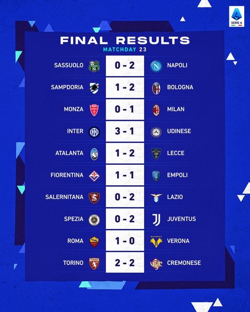สถานการณ์ ตารางคะแนน ล่าสุด ของศึก กัลโช่ เซเรียอา หลังจบสัปดาห์ที่ 23 นั้น ยังเป็น นาโปลี ที่นำห่างเป็นจ่าฝูง ด้วยการมี 62 แต้ม ส่วน อินเตอร์ มิลาน รั้งอยู่รองจ่าฝูงด้วยการมี 47 แต้ม และอันดับที่สามเป็น โรม่า ที่ขยับมามี 44 คะแนน แต่ประตูได้เอซี มิลาน