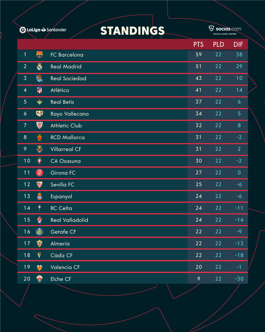 อันดับตารางคะแนน ลาลีกา สเปน 2022/2023 หลังจบนัดที่22 โดย 5 อันดับแรกในตารางเป็นไปตามลำดับมีดังนี้