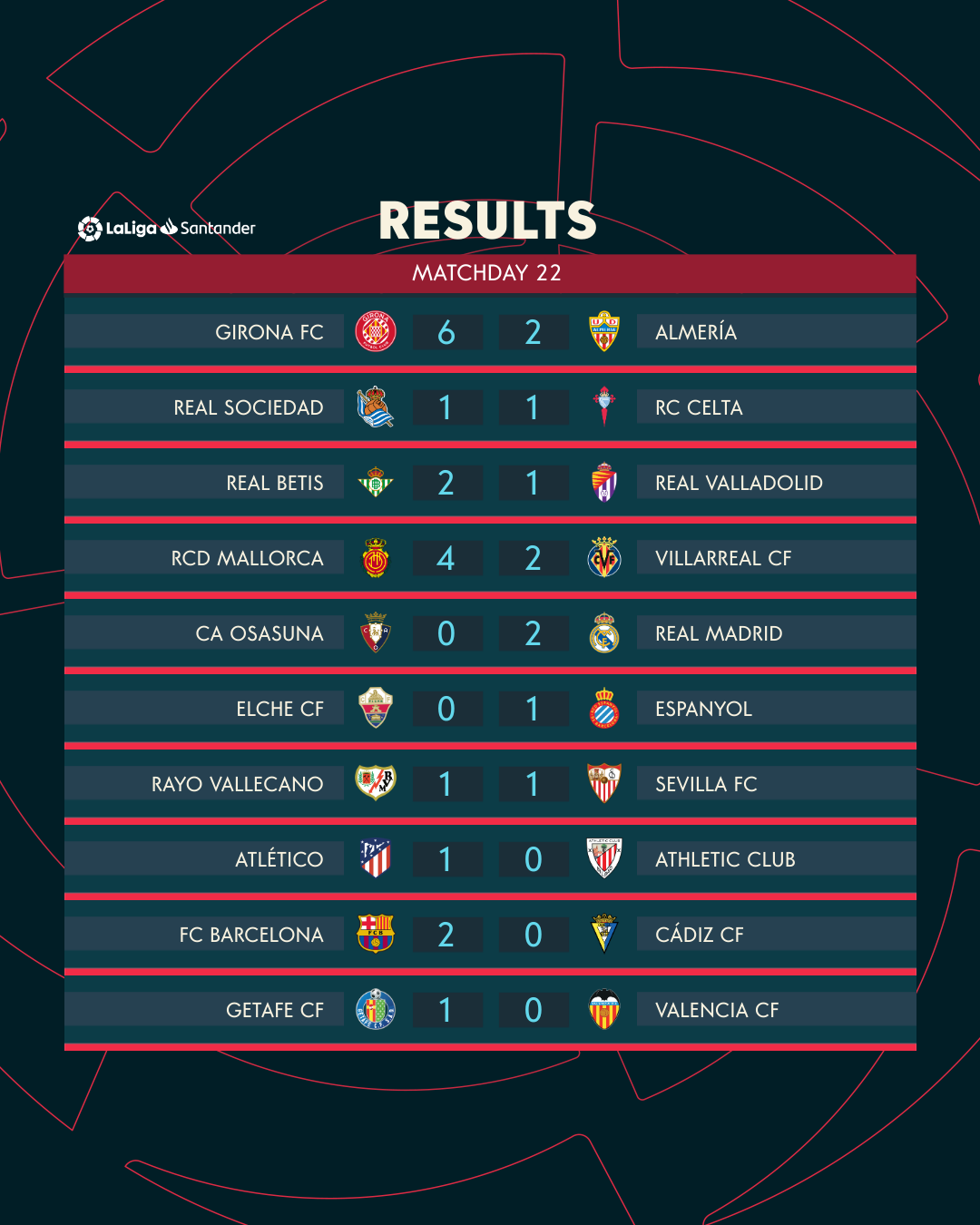 สรุปผลการแข่งขัน ลาลีกา สเปน หลังจบสัปดาห์ที่ 22