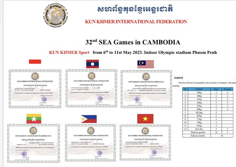 วันที่ 21 ก.พ. 2023 ทางสหพันธ์ กุน ขแมร์ นานาชาติ (เคเคไอเอฟ) ออกมาประกาศยืนยันอย่างเป็นทางการว่ามี 7 ชาติ ที่พร้อมส่งทีมเข้าการแข่งขัน “กุน ขแมร์” ในศึกซีเกมส์ 2023 ที่จะถึงนี้