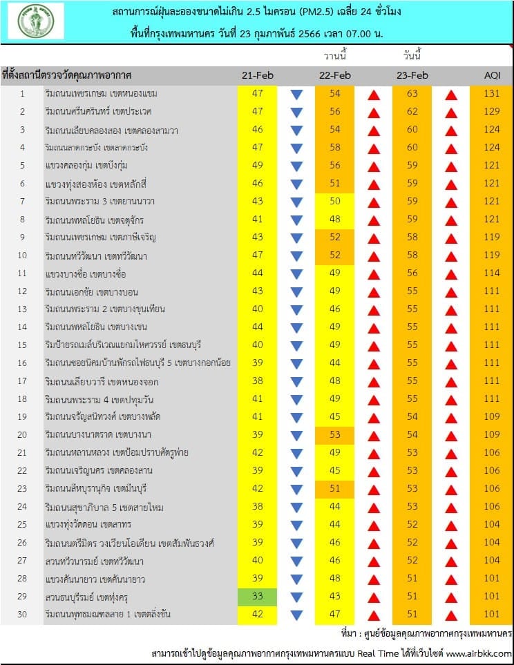 สภาพอากาศ โดย ศูนย์ข้อมูลคุณภาพอากาศกรุงเทพมหานคร รายงานสถานการณ์ฝุ่นละอองขนาดไม่เกิน 2.5 ไมครอน หรือ PM 2.5 ประจำวันที่ 23 กุมภาพันธ์ 2566 เวลา 07.00 น. ตรวจวัดได้ 38-63 ไมโครกรัม/ลูกบาศก์เมตร (มคก./ลบ.ม.)