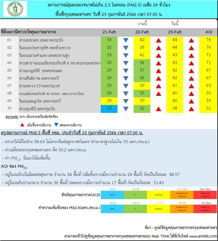 สภาพอากาศ โดย ศูนย์ข้อมูลคุณภาพอากาศกรุงเทพมหานคร รายงานสถานการณ์ฝุ่นละอองขนาดไม่เกิน 2.5 ไมครอน หรือ PM 2.5 ประจำวันที่ 23 กุมภาพันธ์ 2566 พบว่าเกินมาตรฐานจำนวน 34 พื้นที่