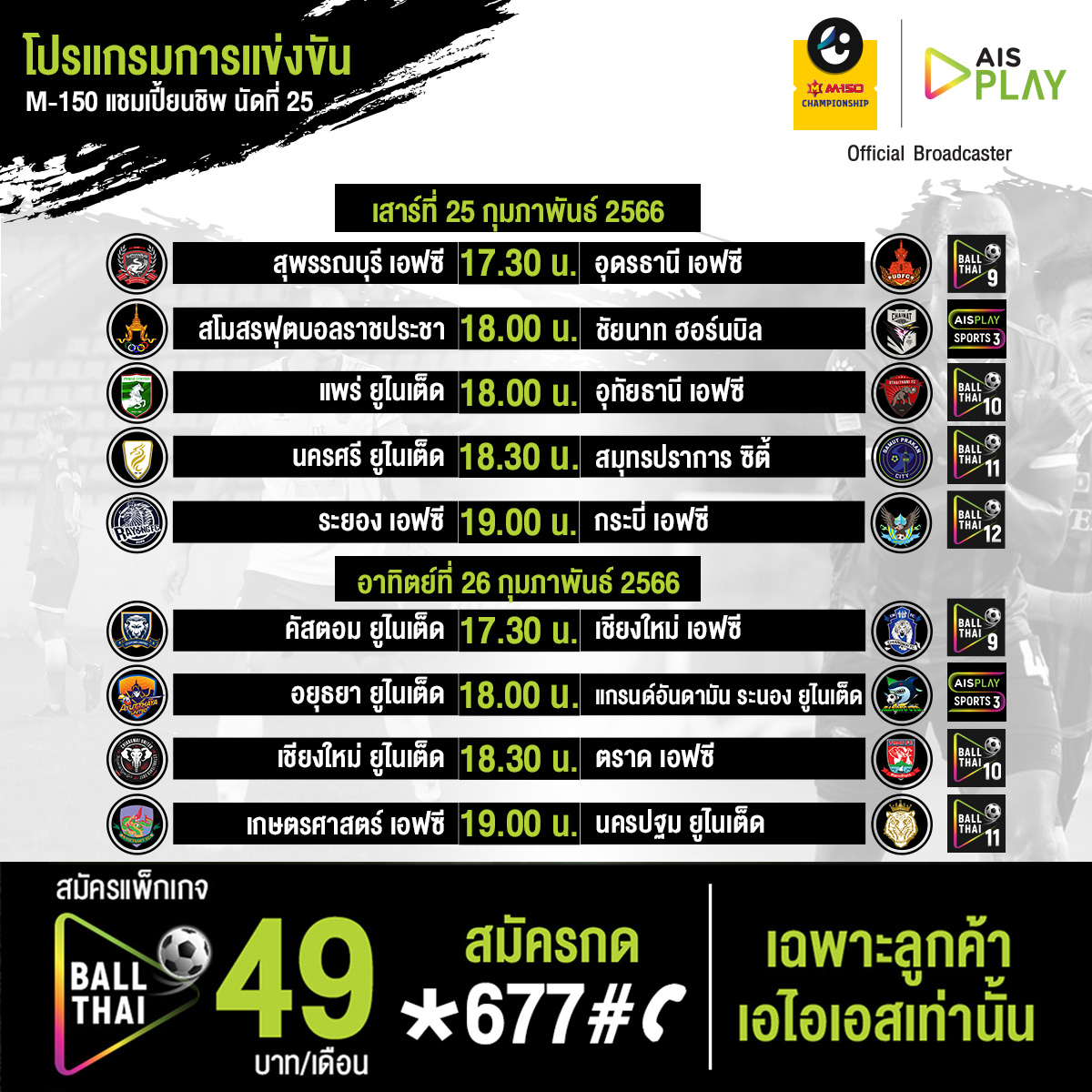 ตารางแข่งขัน ไทยลีก2 M-150 แชมเปี้ยนชิพ โปรแกรมฟุตบอลไทยลีก 2 สัปดาห์ที่ 25 ทุกคู่ถ่ายทอดสดทาง AIS Play