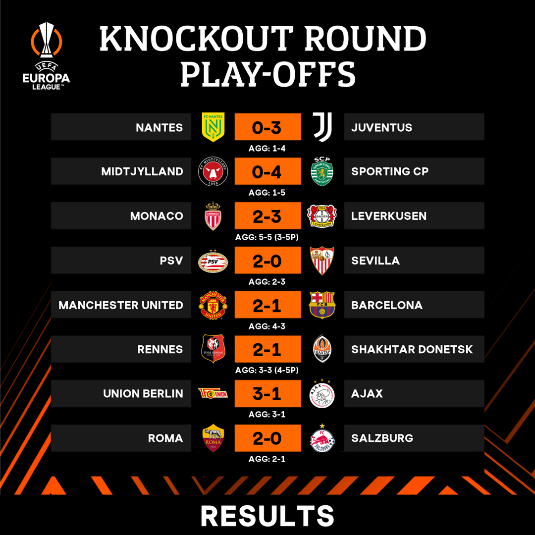 ทำให้ล่าสุดเราได้ทีมที่เข้ารอบ 16 ทีมสุดท้ายยูโรป้า ลีกเรียบร้อยแล้ว ได้แก่ทีม ชัคห์เตอร์ฯ, โรม่า, แมนฯ ยูไนเต็ด, ยูเนี่ยน เบอร์ลิน, สปอร์ติ้ง ลิสบอน, เซบีย่า, ยูเวนตุส, เลเวอร์คูเซ่น โดยการจับสลากจะมีขึ้นในช่วงเย็นวันศุกร์ที่ 24 ก.พ. นี้
