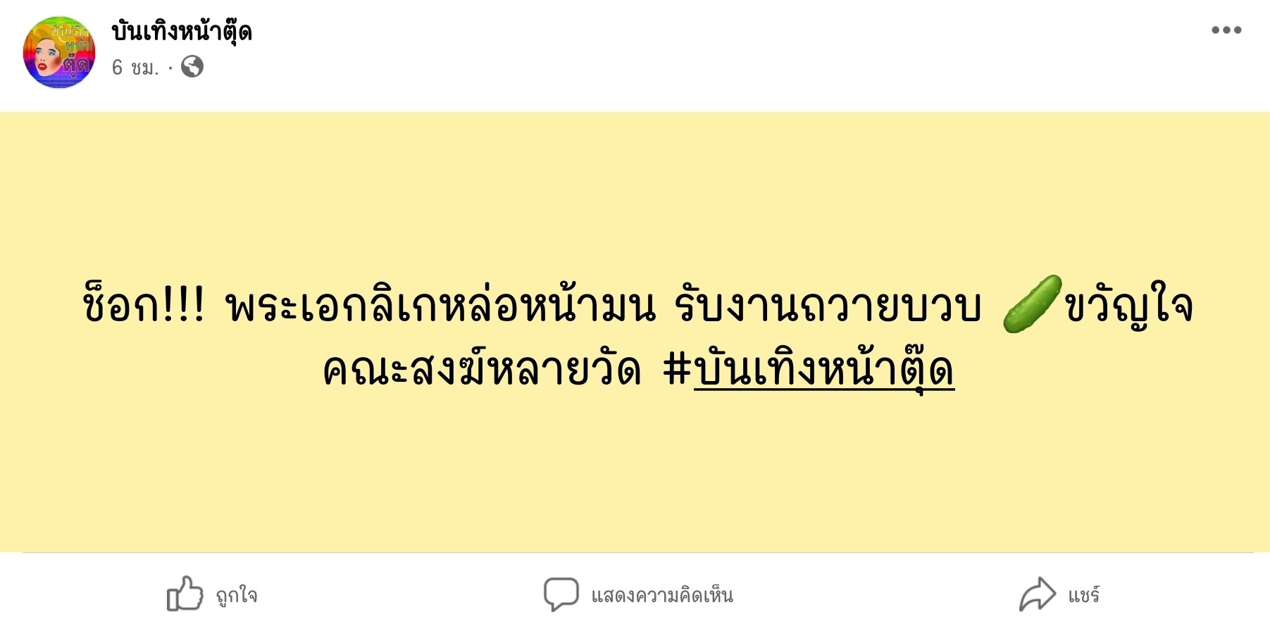 ทางเพจระบุข้อความว่า “ช็อก!!! พระเอกลิเกหล่อหน้ามน รับงานถวายบวบ 🥒ขวัญใจคณะสงฆ์หลายวัด #บันเทิงหน้าตุ๊ด”