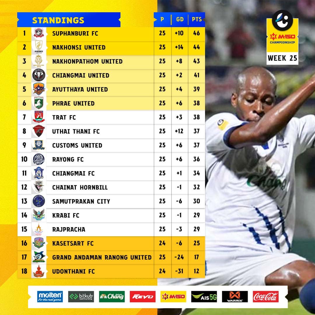 1. สุพรรณบุรี เอฟซี แข่ง 25 นัด มี 46 แต้ม