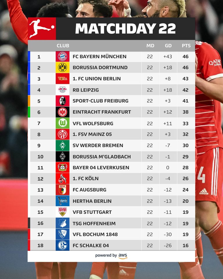 อันดับ ตารางคะแนน บุนเดสลีกา เยอรมัน 2022/2023 หลังจบแมตซ์เดย์ที่22 โดย 5 อันดับเป็นไปตามลำดับมีดังนี้