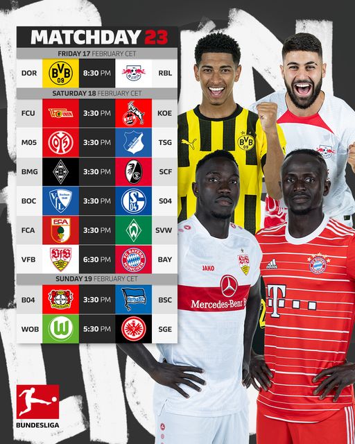 โปรแกรมบอล บุนเดสลีกา เยอรมัน ประจำฤดูกาล 20222/23 โดย ตารางแข่ง บุนเดสลีกา 2022 ล่าสุด สัปดาห์ที่23 เริ่มที่คืนวันศุกร์ที่ 3 มีนาคม 2566 ดอร์ทมุนด์ พบ ไลป์ซิก ส่วนคู่ที่น่าสนใจในคืนวันเสาร์ที่ 4 มีนาคม คู่ไฮไลท์จะเป็น สตุ๊ตการ์ท พบ บาเยิร์น ส่วนในคืนวันอาทิตย์ที่ 5 มีนาคม จะมีคู่ โวล์ฟสบวร์ก พบ แฟร้งค์เฟิร์ต
