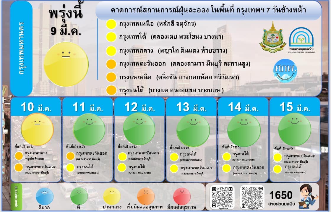 หลังวันที่ 9 มี.ค. 66 เป็นต้นไปสถานการณ์ในพื้นที่กรุงเทพมหานครและปริมณฑลมีแนวโน้มที่ดี เนื่องจากลมทางใต้ช่วยพัดพาฝุ่นละอองออกจากพื้นที่