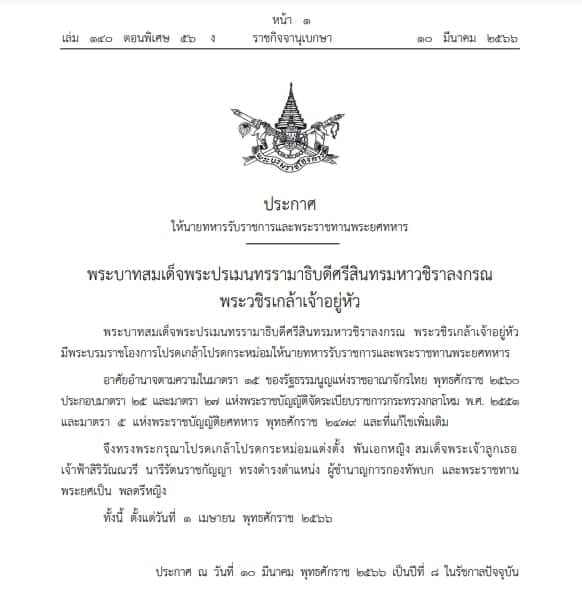 เว็บไซต์ราชกิจจานุเบกษา เผยแพร่ประกาศเรื่อง ให้นายทหารรับราชการและพระราชทานพระยศทหาร ความว่า