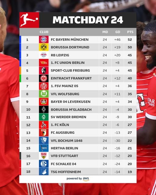 อันดับ ตารางคะแนน บุนเดสลีกา เยอรมัน 2022/2023 หลังจบแมตซ์เดย์ที่24 โดย 5 อันดับเป็นไปตามลำดับมีดังนี้
