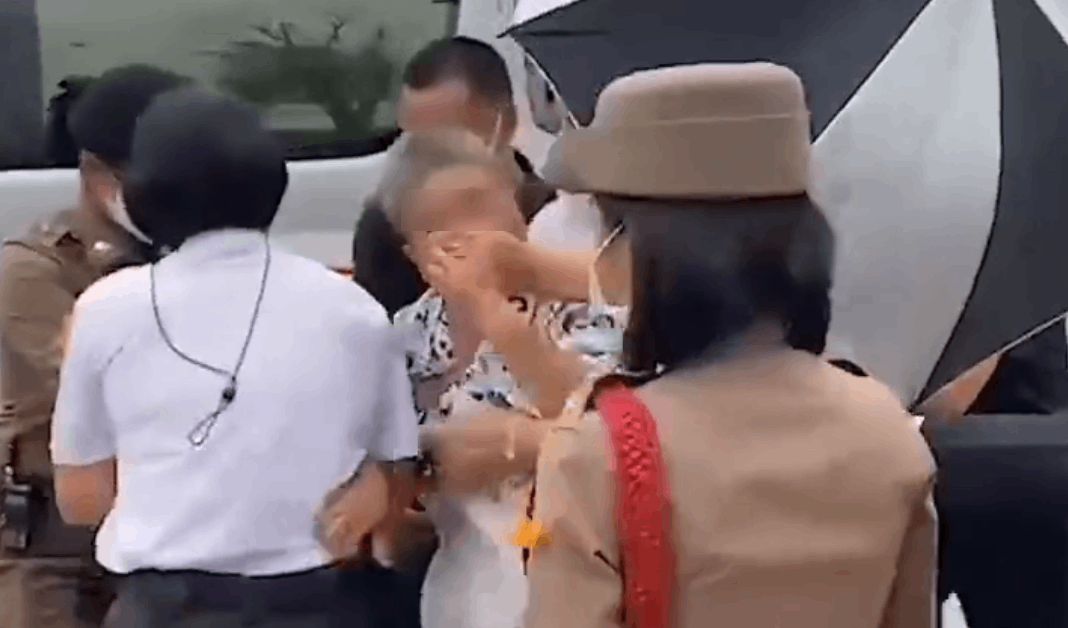 เจ้าหน้าที่ได้กระชากเข้าไปยังซอกรถตู้และเอาร่มกางเพื่อกันไม่ให้ผู้สื่อข่าวเก็บภาพ และบางช่วงได้เอามือปิดปากเพื่อไม่ให้หญิงสูงอายุตะโกนใส่ขบวนรถของนายกรัฐมนตรี แต่ช่วงหนึ่งมือของเจ้าหน้าที่หลุดจากปากของหญิงสูงวัย ช่วงที่ขบวนรถของ พล.อ. ประยุทธ์ ผ่านพอดี หญิงสูงวัยจึงตะโกนด่าอย่างรุนแรง