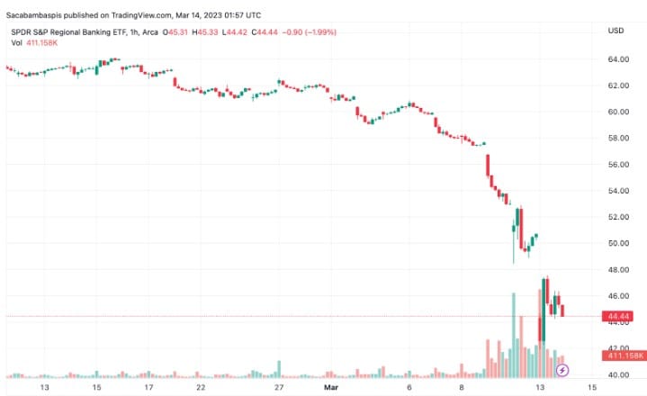นอกจาก “First Republic Bank” แล้ว ราคากองทุน SPDR S&P Regional Banking ETF ก็ได้ร่วงลงเช่นกัน โดยร่วงลง 16 เปอร์เซ็นต์ ลงมาอยู่ที่ 44.45 ดอลลาร์ในขณะที่รายงานล่าสุดนั่นเอง