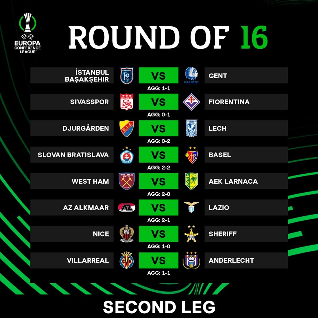 โปรแกรมแข่งขัน ยูฟ่า ยูโรป้า คอนเฟอเรนซ์ลีก 2022 รอบ 16 ทีมสุดท้าย นัดสอง
