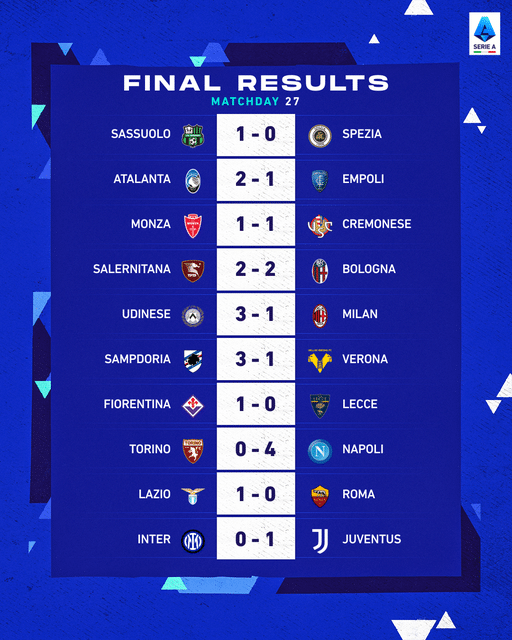 สถานการณ์ ตารางคะแนน ล่าสุด ของศึก กัลโช่ เซเรียอา หลังจบสัปดาห์ที่ 27 นั้น ยังเป็น นาโปลี ที่นำห่างเป็นจ่าฝูงแบบทิ้งรองฝูงไปไกล ด้วยการมี 71 แต้ม ส่วน ลาซิโอ แซง อินเตอร์ มิลาน ขึ้นมารั้งอยู่รองจ่าฝูงด้วยการมี 52 แต้ม ด้านที่ เอซี มิลาน อยู่อันดับ 4 มี 48 คะแนนเท่าเดิม ส่วน โรม่า รั้งที่ห้า มี 47 คะแนน
