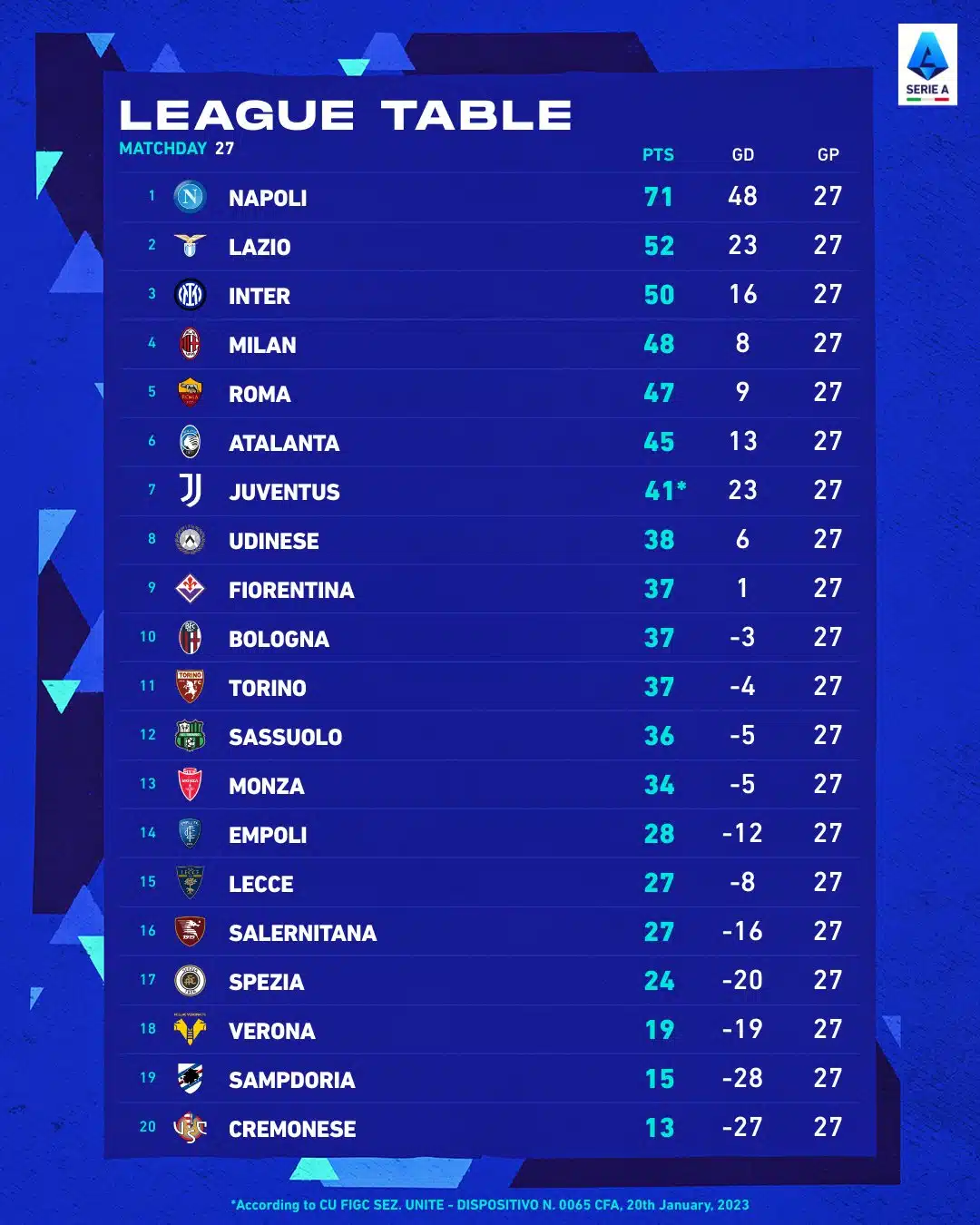 อันดับ ตารางคะแนน กัลโช่ เซเรียอา อิตาลี 2022 2023 หลังจบนัดที่27 โดย 5 อันดับเป็นไปตามลำดับมีดังนี้