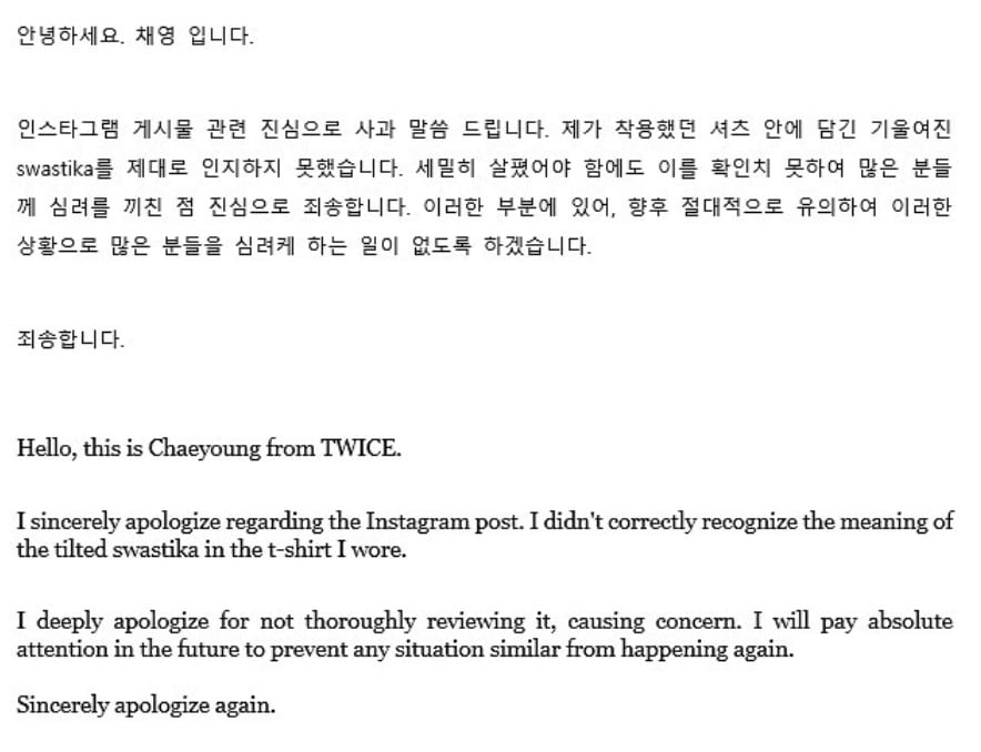 ล่าสุดนักร้องสาว แชยอง ก็ไม่ได้นิ่งนอนใจ ออกแถลงการณ์ขอโทษต่อทุกคนที่ได้รับผลกระทบทางจิตใจผ่านอินสตาแกรมส่วนตัว IG @chaeyo.0 บอกว่าเธอนั้นขอโทษ และเสียใจกับสิ่งที่เธอทำลงไปจริง ๆ เพราะเธอไม่รู้ความหมายของสัญลักษณ์นี้มาก่อน และสัญญาว่าจะไม่ให้เกิดเรื่องแบบนี้ขึ้นอีก