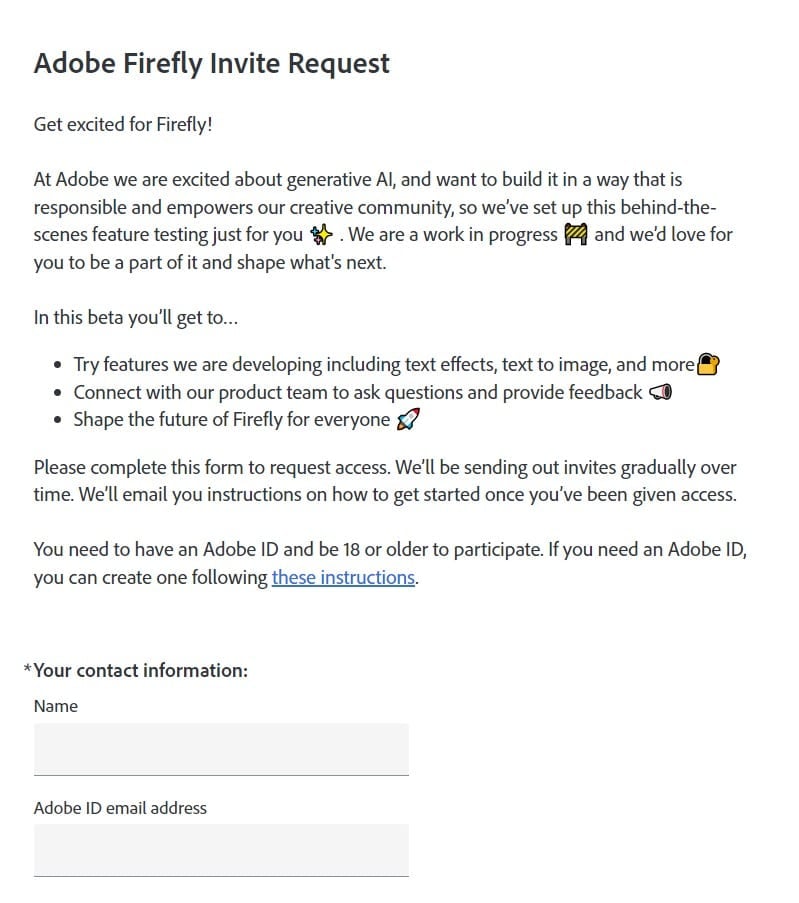 ณ ตอนนี้ (23 มี.ค. 66) Firefly ยังอยู่ในรุ่น Beta ซึ่งยังคงจำกัดจำนวนผู้เข้าใช้งาน ทำให้ต้อง “Request access” ให้ทาง Adobe อนุมัตก่อนถึงจะสามารถเข้าใช้งานได้