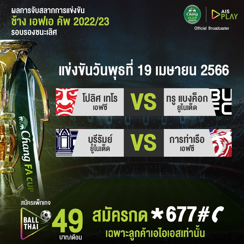 สรุปผลจับสลาก ช้าง เอฟเอ คัพ 2022/23 รอบรองชนะเลิศ ผลมีดังนี้