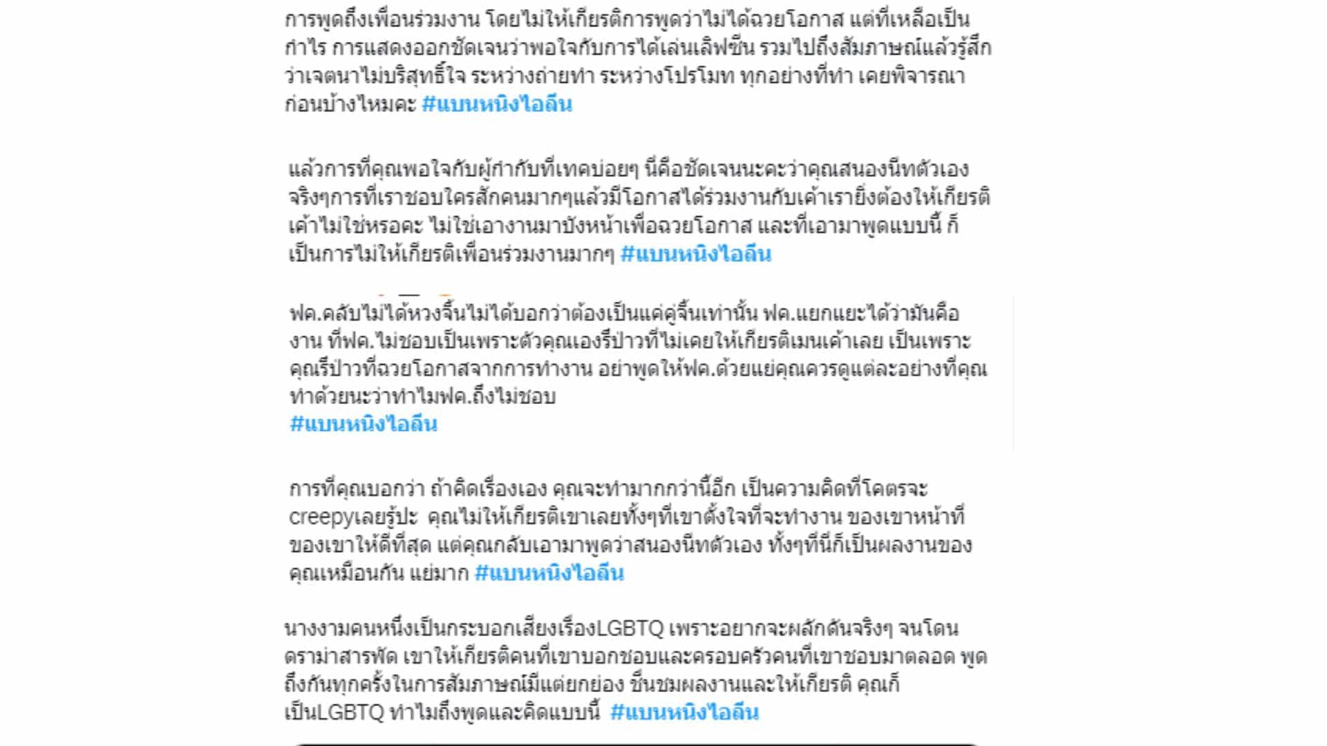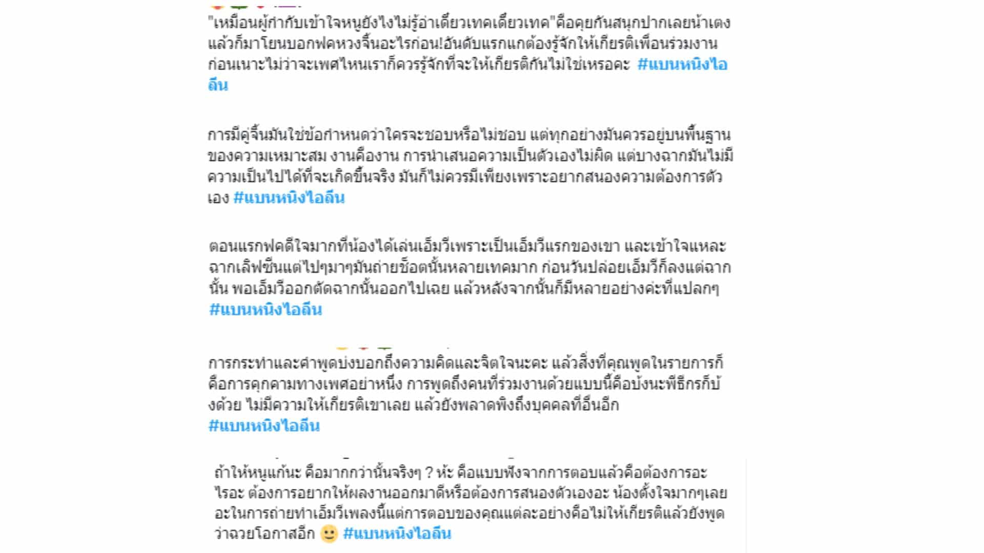 “การพูดถึงเพื่อนร่วมงาน โดยไม่ให้เกียรติการพูดว่าไม่ได้ฉวยโอกาส แต่ที่เหลือเป็นกำไร การแสดงออกชัดเจนว่าพอใจกับการได้เล่นเลิฟซีน รวมไปถึงสัมภาษณ์แล้วรู้สึกว่าเจตนาไม่บริสุทธิ์ใจ ระหว่างถ่ายทำ ระหว่างโปรโมท ทุกอย่างที่ทำ เคยพิจารณาก่อนบ้างไหมคะ #แบนหนิงไอลีน”