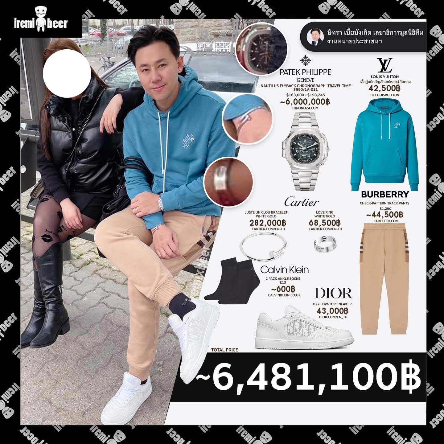 เพจดังเผย ราคาเครื่องนาฬิกาทนายตั้ม และเสื้อผ้า โดยระบุว่านาฬิกาที่ทนายตั้มใส่นั้นเป็นยี่ห้อ Patek Phillipe ราคา เรือนละ 6 ล้านบาท