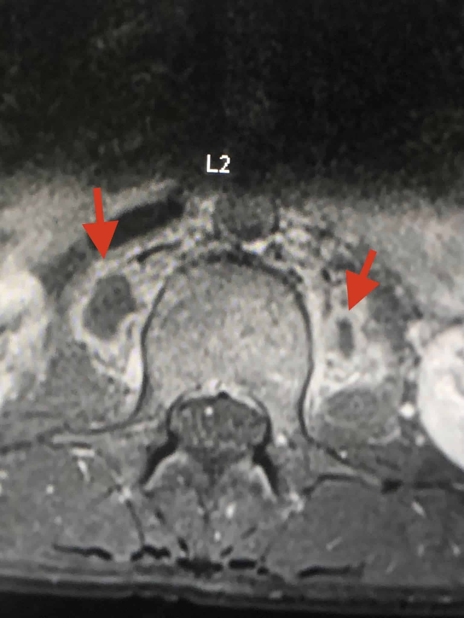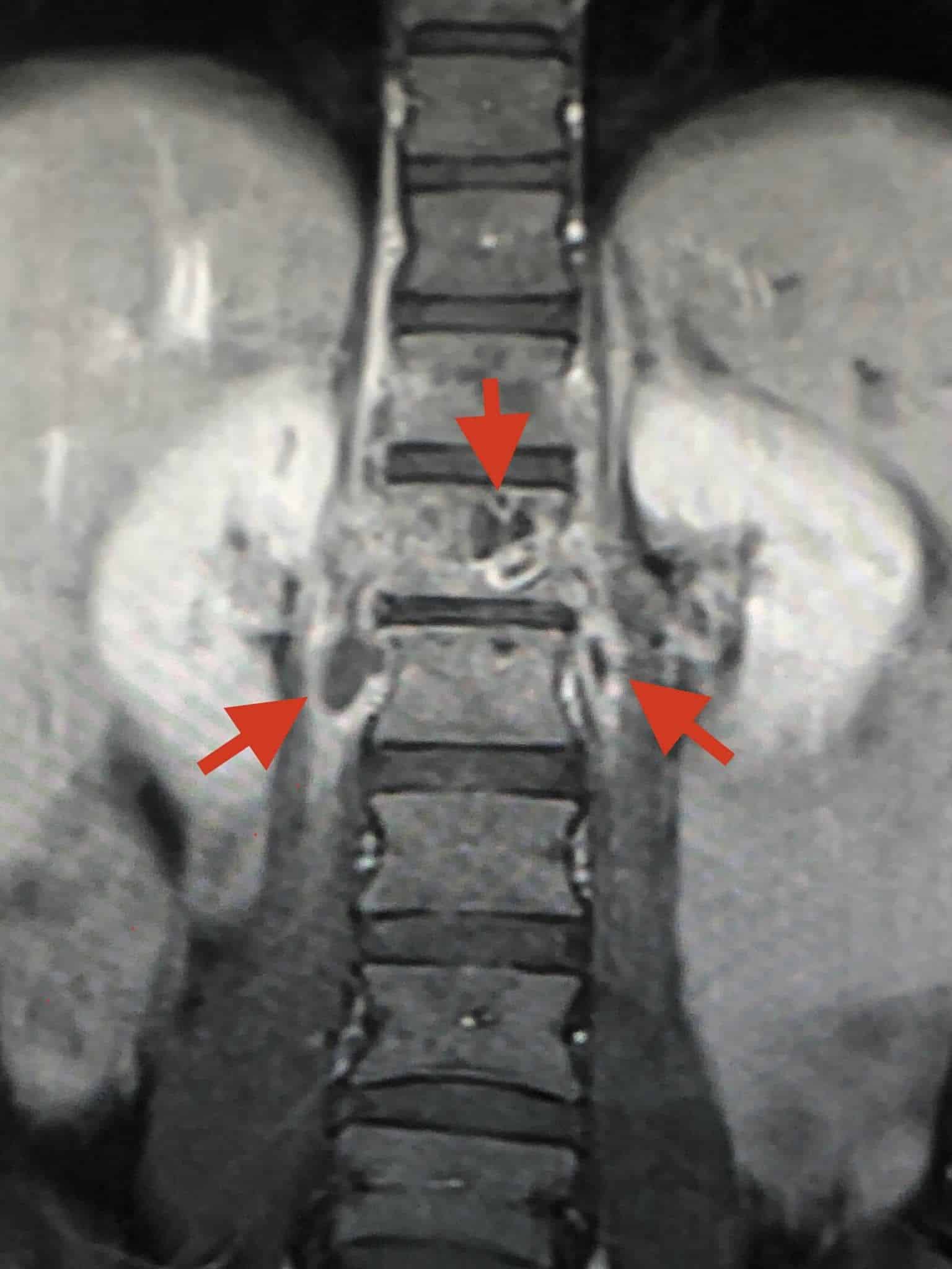 ตรวจร่างกายปกติ เจาะเลือดทุกอย่างปกติ เอกซเรย์ปอดและกระดูกสันหลังส่วนเอวปกติ ทำคลื่นแม่เหล็กไฟฟ้ากระดูกสันหลังส่วนเอว (MRI lumbar spine) ผิดปกติ สงสัยเป็นวัณโรคของกระดูกสันหลังส่วนเอว (lumbar spine) ชิ้นที่หนึ่ง และสงสัยมีการอักเสบรอบ ๆ เนื้อเยื่อกระดูกสันหลังส่วนเอวชิ้นที่ 1 และ 2 ร่วมด้วย (ดูรูป)