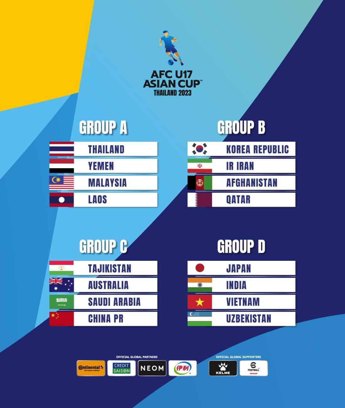 การแข่งขันรายการ ฟุตบอลชิงแชมป์เอเชีย รุ่นอายุไม่เกิน 17 ปี จัดขึ้นะหว่างวันที่ 15 มิถุนายน – 2 กรกฎาคม 2023 โดยผลการจับสลากมีดังนี้