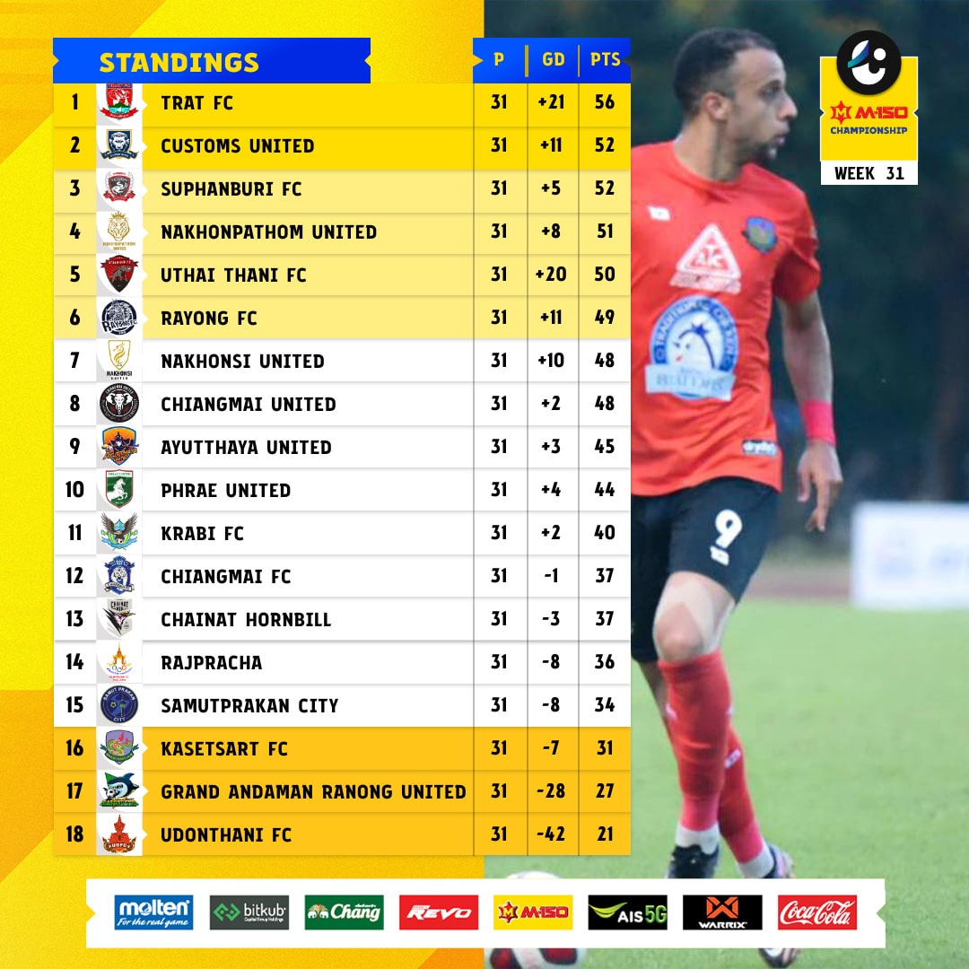 1. ตราด เอฟซี แข่ง 31 นัด มี 56 แต้ม