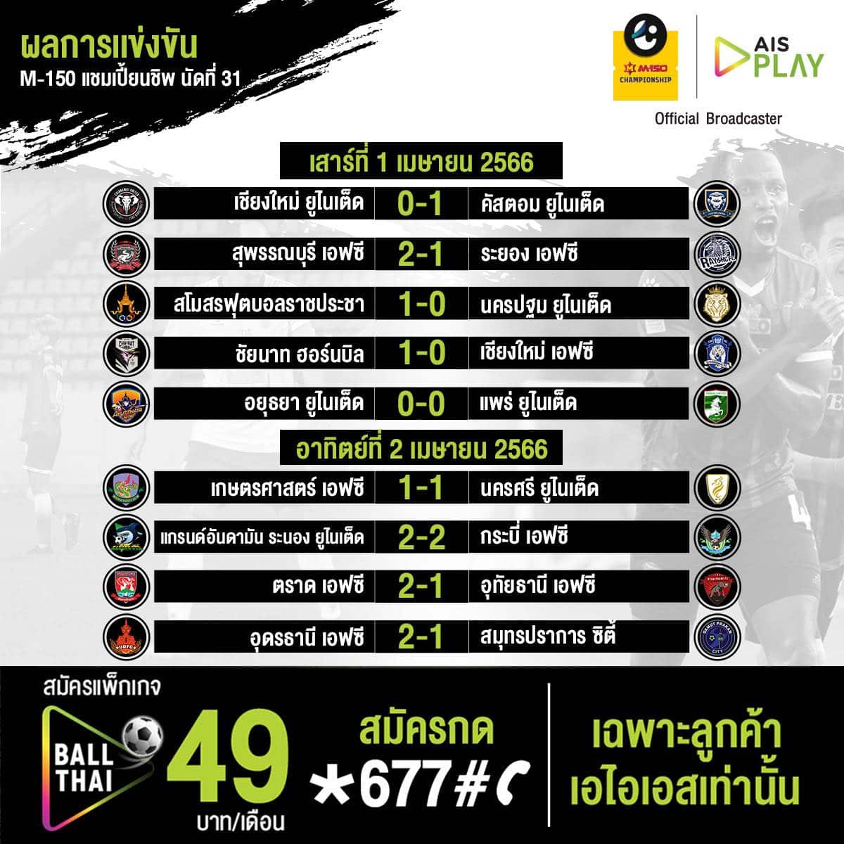 อันดับตารางคะแนน ไทยลีก2 M-150 แชมเปี้ยนชิพ 2022 2023 หลังจบนัดที่ 31 โดย 5 อันดับเป็นไปตามลำดับดังนี้