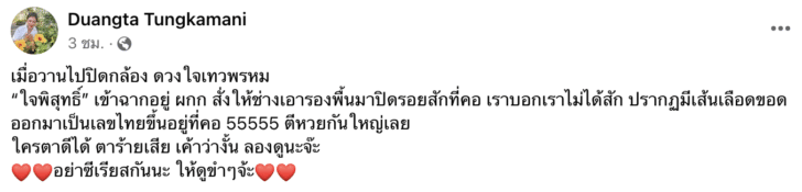ตุ๊ก ดวงตาได้เขียนข้อความเล่าว่า‘เมื่อวานไปปิดกล้อง ดวงใจเทวพรหม